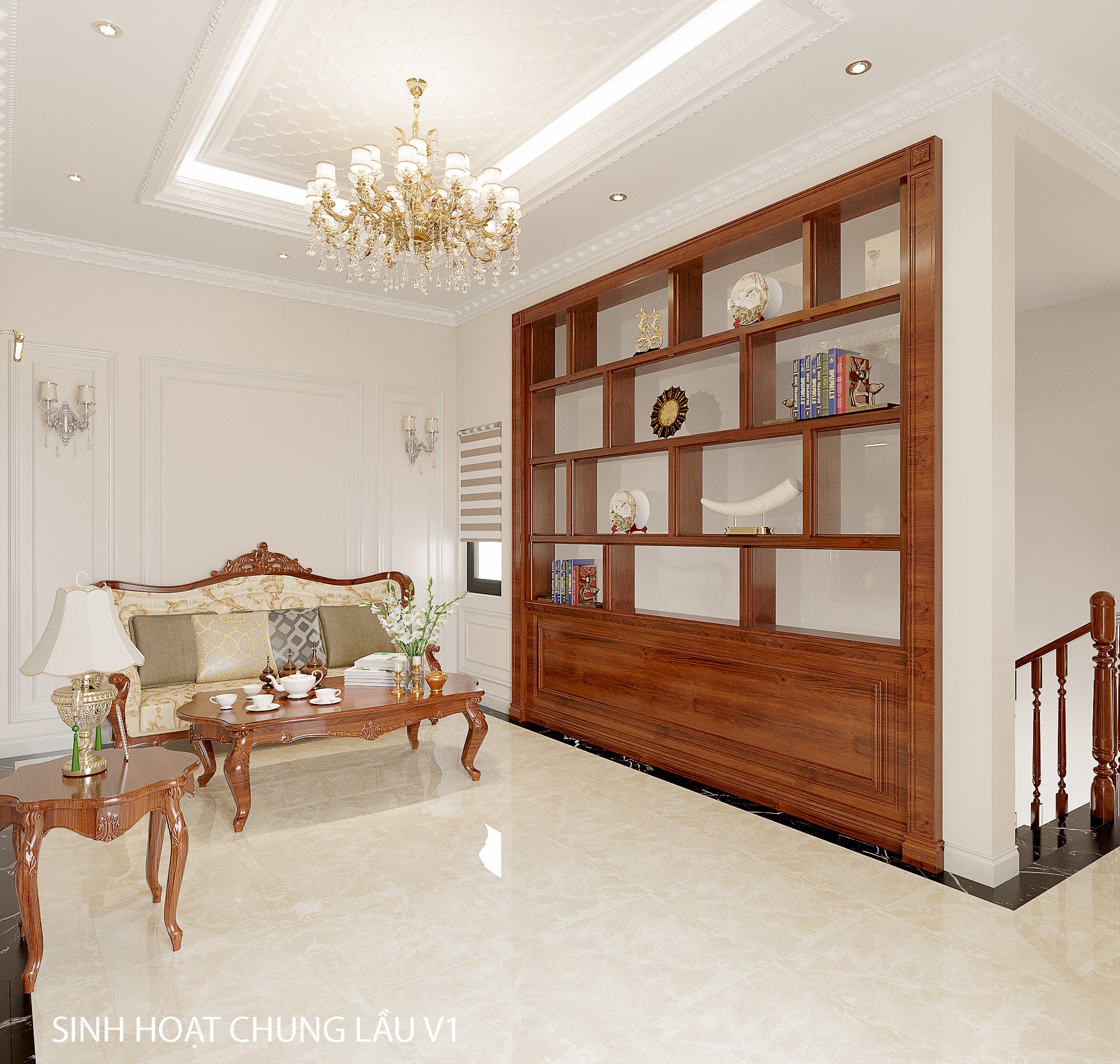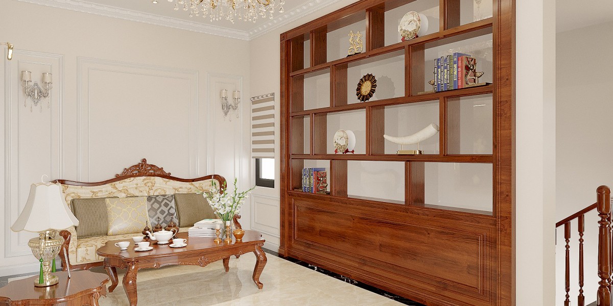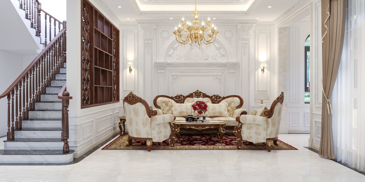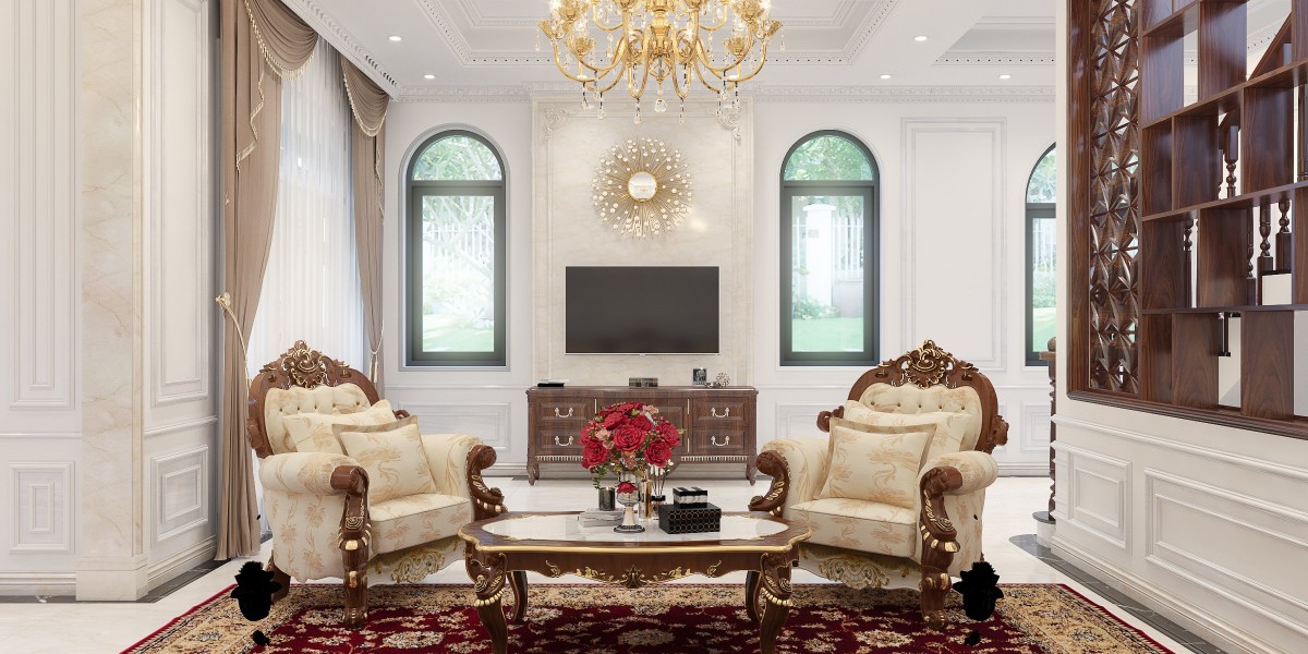 Sử dụng chất liệu gỗ cho bàn, ghế và cả khung tivi. Ghế gỗ sô pha được bọc da trắng kèm theo họa tiết nổi bật. Nó được đặt xung quanh bàn được chạm trổ tinh xảo, tỉ mỉ. Sự quý tộc của gia chủ cũng được nâng lên khi ngồi xuống chiếc ghế này. Ngay cả khung tivi cũng được làm bằng gỗ nằm cũng được chạm nổi những đường nét uốn lượn, chi tiết.