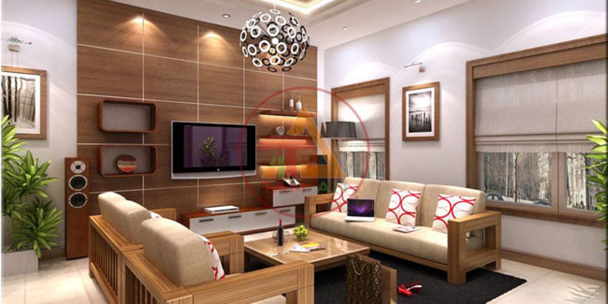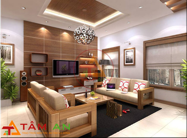 Phòng khách tone màu ấm, cây xanh được đặt ở những góc phòng khách tạo nên sự tươi mát cho căn phòng