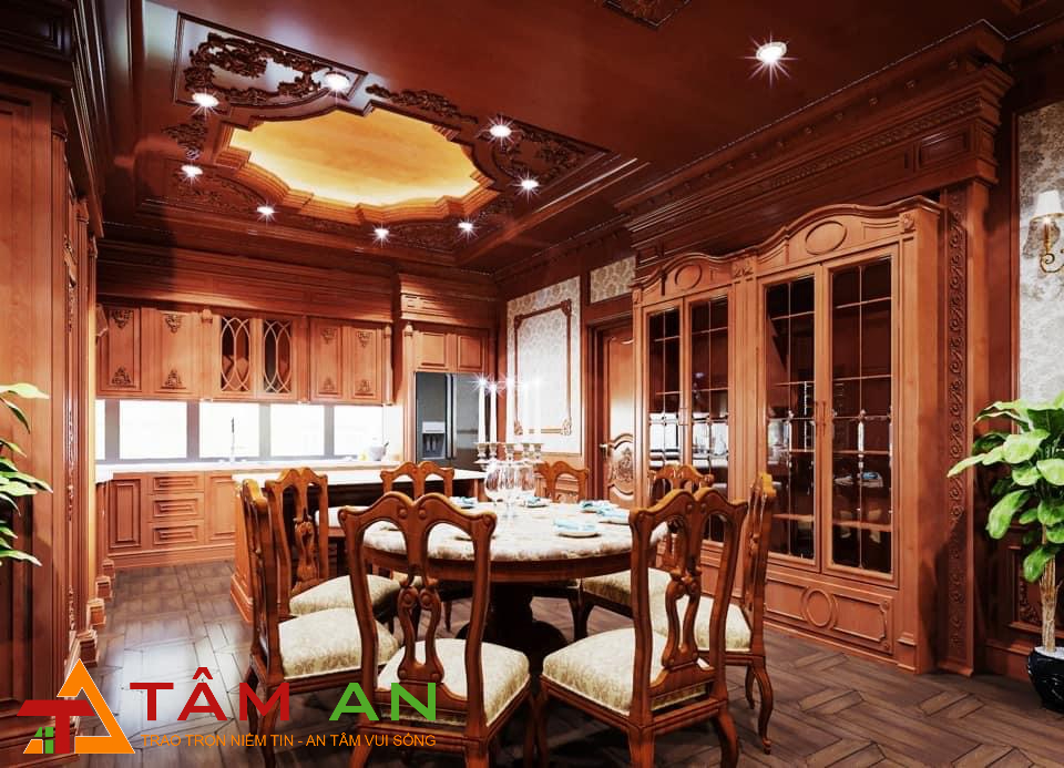 Khu bếp và phòng ăn rộng rãi, có thêm quầy Bar có thể ngồi uống rượu, hay là nơi chế biến thức ăn cũng rất thoải mái. Bên cạnh đó là mẫu bàn ăn tròn theo kiến trúc cổ điển, có thể ngồi thoải mái cho 8 người đúng như mong muốn gia đình.