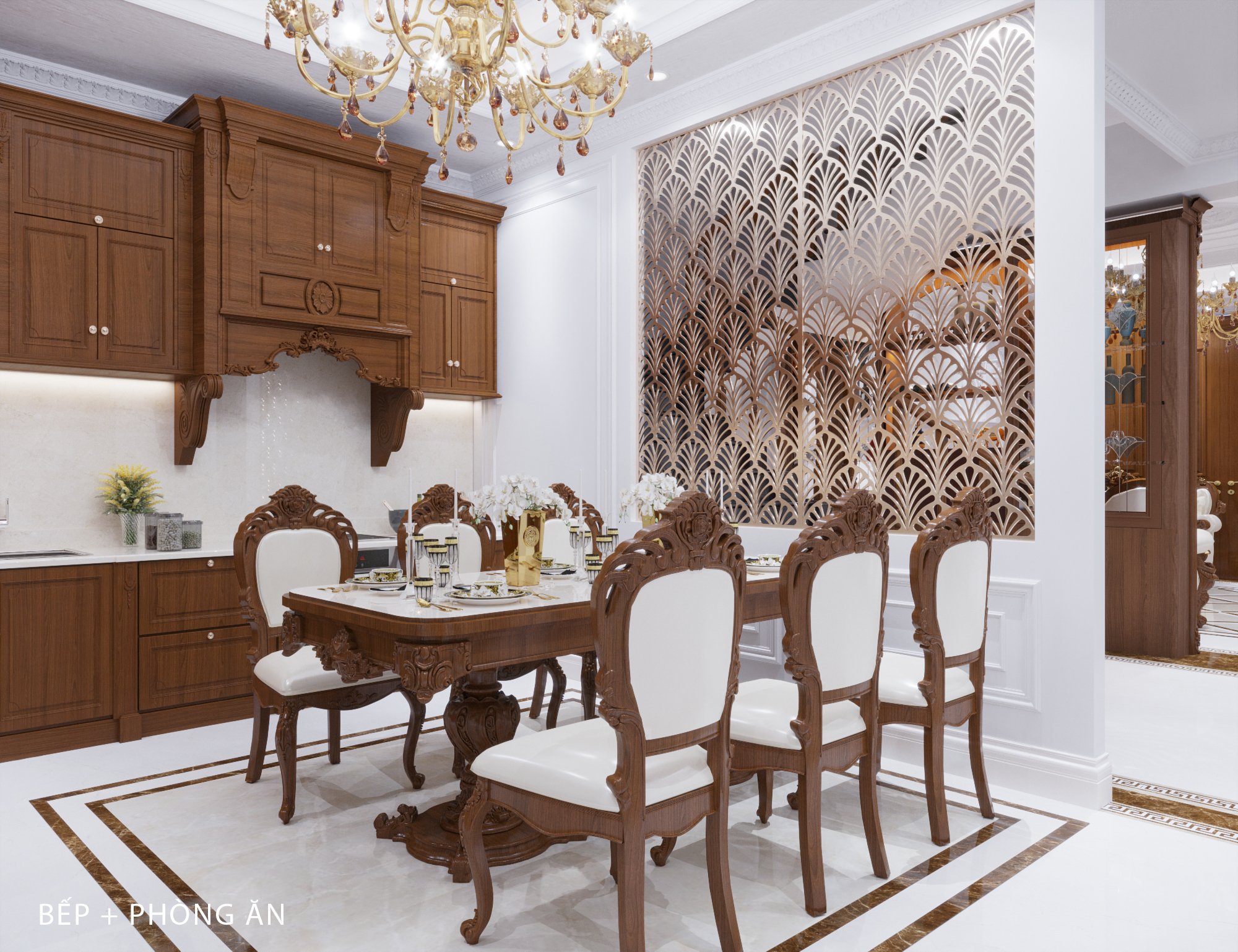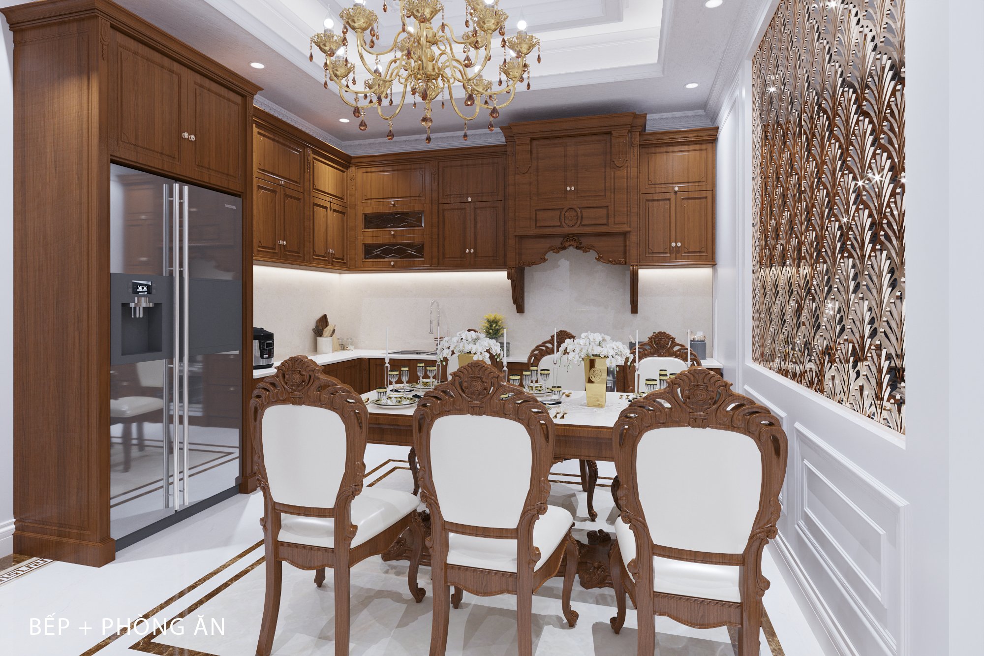 Nội thất bếp, đến nội thất phòng ăn đều được trang bị cao cấp, tôn lên đẳng cấp đỉnh cao. Từ phòng khách nhìn vào tạo được ấn tượng riêng sự tinh tế, sang trọng của từng không gian bếp. Kiểu tủ bếp chữ L phù hợp với đa số không gian bếp, với thiết kế giúp bạn tận dụng không gian góc một cách hiệu quả, khu vực đi lại nấu nướng rộng rãi, thoải mái, Dễ dàng điều chỉnh độ dài của bếp và phân chia khu vực nấu nướng dễ dàng.