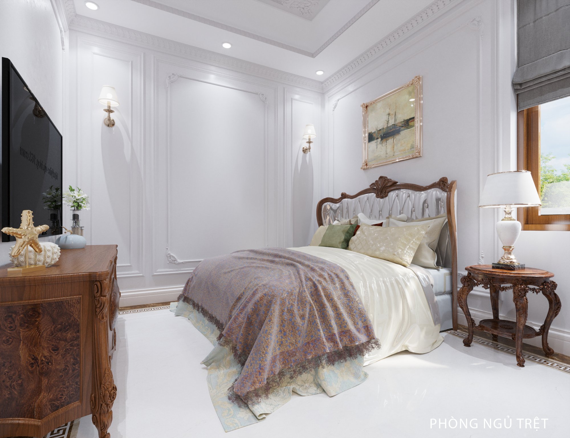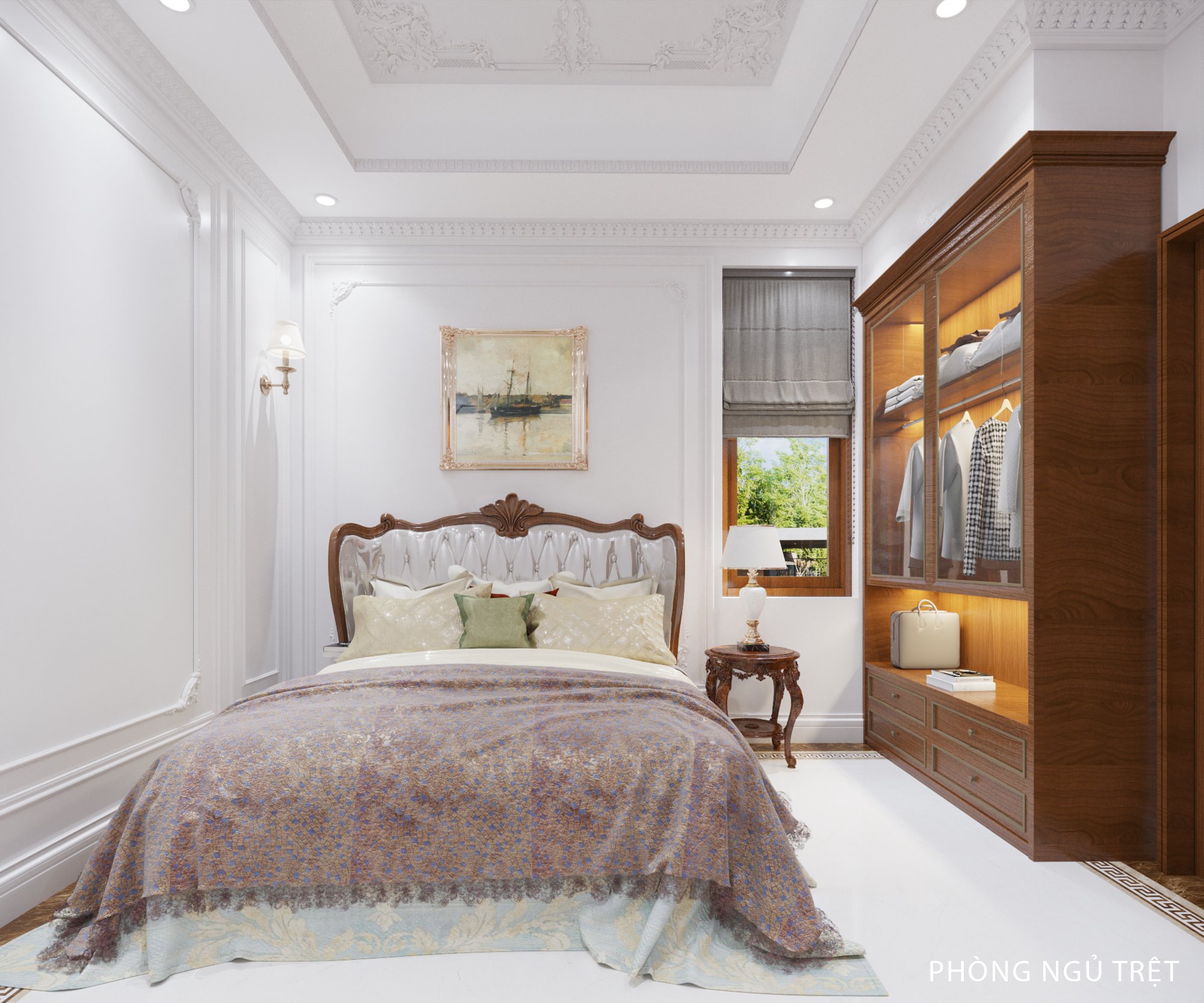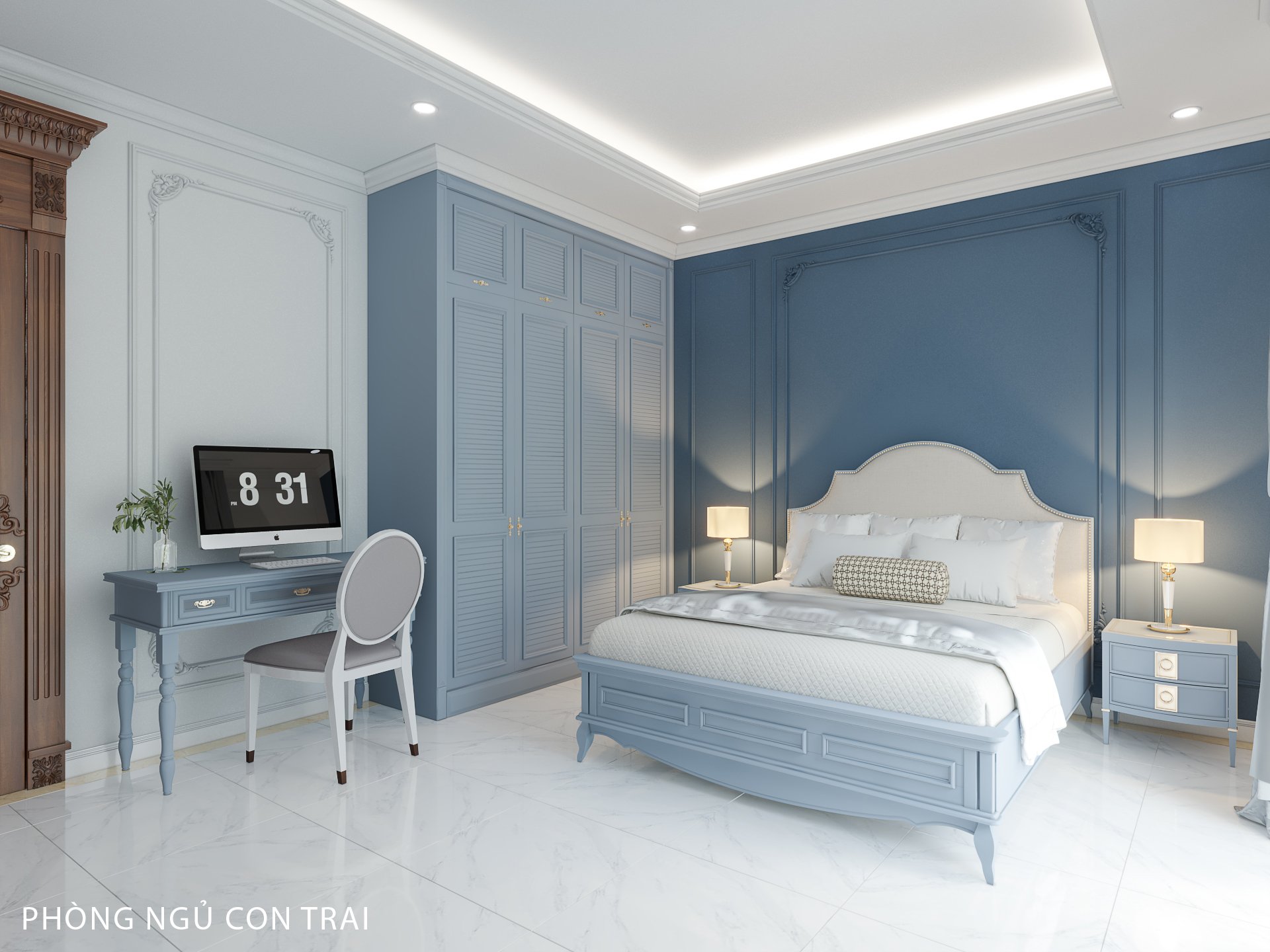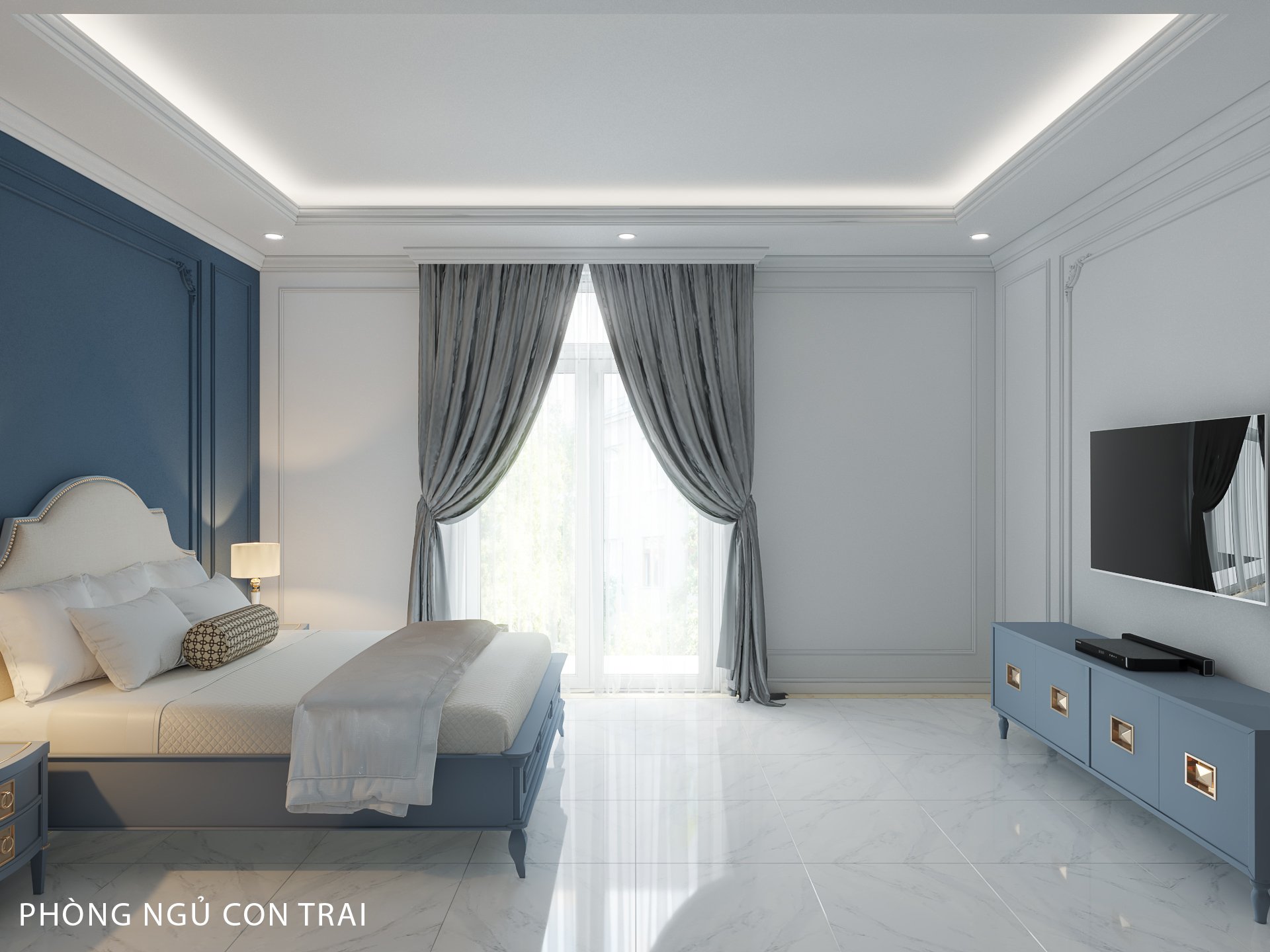 Gam màu xám xanh được dùng làm điểm nhấn cho phòng ngủ. Phần đèn ngủ được cách điệu về màu sắc giúp không giãn vẫn toát lên vẻ sang trọng. Vách ốp đầu giường cũng là điểm nhấn không thể bỏ qua. Đây là một lựa chọn hoàn hảo cho gia chủ. Tủ để đồ kết hợp với kệ ti vi được ưu ái về diện tích. Đồng thời tủ đầu giường cũng được thiết kế rất tinh tế khiến chủ nhân căn phòng hết sức hài lòng. Tâm An còn thiết kế ban công kết hợp đón ánh sáng và gió tự nhiên tạo cảm giác trong lành cho căn phòng. Không áp dụng chi tiết cầu kỳ, rườm rà như cổ điển mà lựa chọn sự nhẹ nhàng, nhấn nhá. Biệt thự tân cổ điển uy nghi có, tươi trẻ có, sắc sảo có, phóng khoáng có.